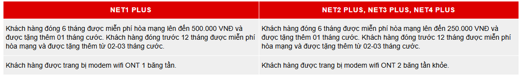 Khuyến mãi: Khi đăng ký gói cước NetPlus 1 khách hàng sẽ được cung cấp modem ONT 1 băng tần. Khách hàng đăng ký gói Net2Plus, Net3Plus và Net4Plus được trang bị modem ONT 2 băng tần. Bên cạnh đó, khách hàng còn được miễn phí hòa mạng từ 250 – 500.000 VNĐ, miễn phí từ 1 tháng nếu đóng cước trước 6 tháng và miễn phí 3 tháng nếu đóng cước trước 12 tháng. Chi tiết chương trình hòa mạng tặng cước và tặng modem khi khách hàng đăng ký gói NetPlus như sau: