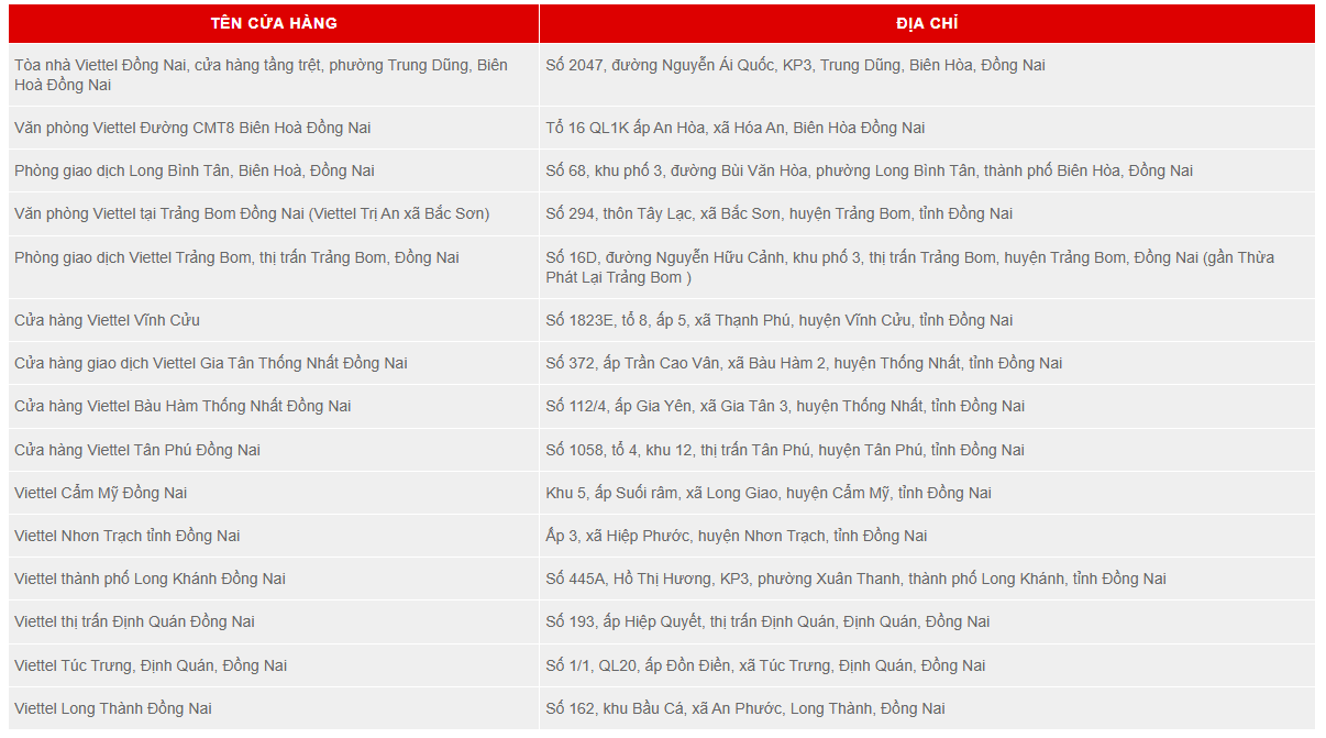 1. Các cửa hàng giao dịch trực tiếp của Viettel tại Đồng Nai