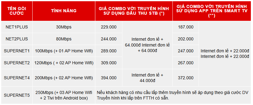 Lưu ý: Các giá trên đã bao gồm VAT. Khách hàng đăng ký gói combo đều được hưởng các ưu đãi tương tự khi đăng ký gói Internet đơn lẻ. Ngoài ra, khách hàng sẽ được trang bị miễn phí Set Top Box (thiết bị giải mã tín hiệu truyền hình dành cho TV thường) xem truyền hình Viettel miễn phí. Bên cạnh đó, truyền hình tích hợp trong gói SuperNet 5 là gói NetVVIP (không có kênh K+). Khách hàng sử dụng Combo Internet + Truyền hình khi hủy 1 trong 2 dịch vụ, dịch vụ còn lại sẽ áp dụng theo giá cước đơn lẻ.