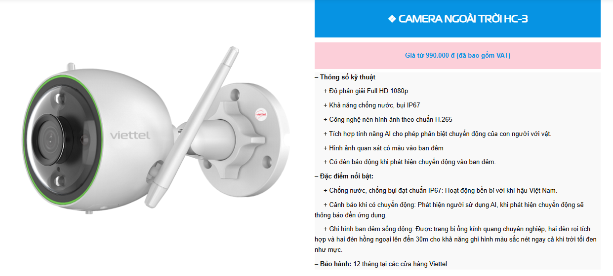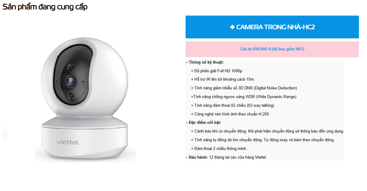 – Dịch vụ Camera của Viettel hỗ trợ khách hàng 24/7, bảo hành thiết bị trong 12 tháng.