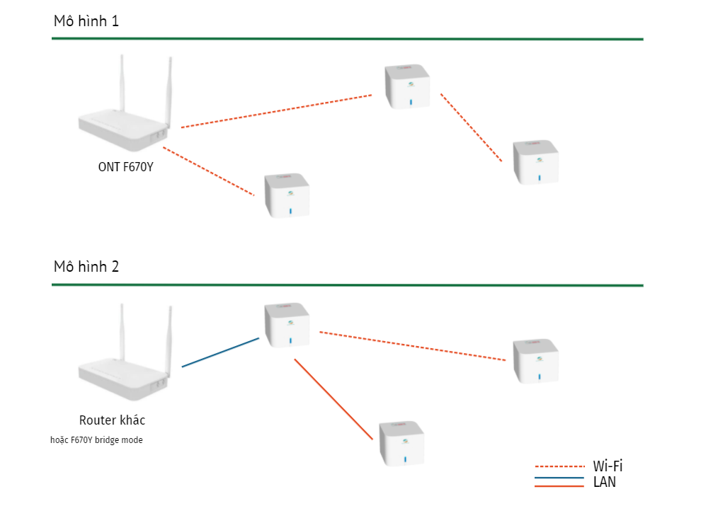 Mô hình 1 – Tận dụng modem F670Y làm thiết bị chính của hệ thống Wifi Mesh.