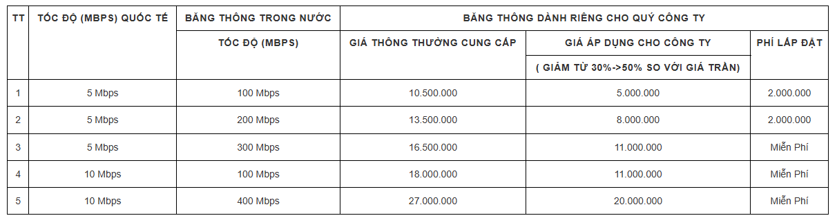 - Phí lắp đặt một tuyến kênh phát triển mới: 2.000.000đ (chưa VAT).