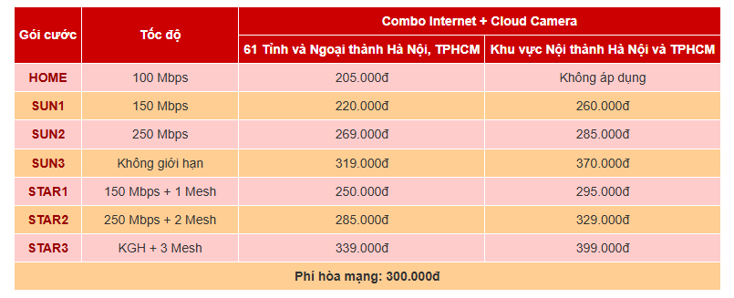– Miễn phí lắp đặt cho camera đầu tiên khi mua gói SUN1 trở lên, từ Camera thứ 2 phí lắp là 150.000đ/camera